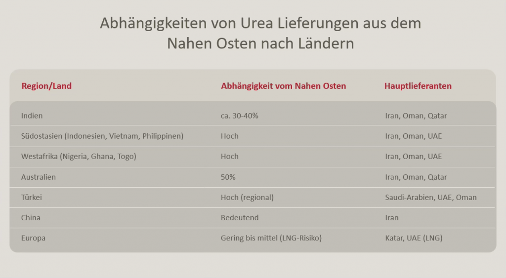 Über die reine Versorgung mit Rohöl hinaus gibt es noch ein weiteres Problem: Einige Länder des Nahen Ostens haben inzwischen eigene Industrien aufgebaut, in denen Öl und Gas als Rohstoffe oder Energie gebraucht werden. Bei einem Anhalten des Konflikts droht daher nicht nur Knappheit bei fossilen Rohstoffen, sondern auch bei einigen für die Weltwirtschaft bedeutenden Produktgruppen. Hierzu zählen petrochemische Produkte, wo 15% des Weltmarktes auf Saudi-Arabien entfällt (Saudi Aramco) und Aluminium, wo 7% des Weltbedarfs in den Vereinigten Arabischen Emiraten und Katar produziert werden. Die größten Auswirkungen könnte aber die Blockade des Seewegs durch den arabischen Golf auf den weltweiten Agrarmarkt haben. Rund 30% der weltweiten Urea-Produktion (50 Millionen Tonnen pro Jahr) kommen aus dem Nahen Osten. Urea ist der wichtigste Grundstoff für Stickstoffdünger. Seit Kriegsbeginn ist sein Preis bereits um 35% gestiegen. Ein anhaltender Angebotsausfall würde insbesondere die Landwirte in Australien, Afrika, Indien, Südostasien und China treffen, die im hohen Maße von Lieferungen aus der Golfregion abhängig sind. Dies könnte erhebliche Ernteausfälle bewirken. USA und Europa wären hierbei etwas weniger betroffen, da man weitgehend autark ist. Deutlich steigende Düngekosten würden aber auch hier ihre negativen Auswirkungen haben. Insbesondere über sinkende Gewinne der Landwirte und höhere Lebensmittelpreise.