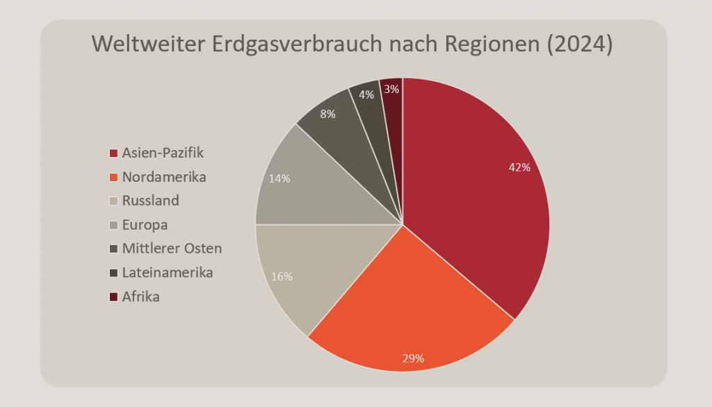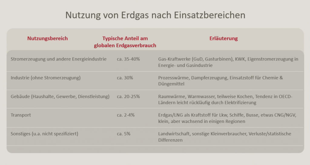 Etwas anders, aber ähnlich breit gefächert ist die Nutzung von Erdgas. Hier spielt das Thema Heizen beziehungsweise – in heißen Regionen – Kühlen eine wesentlich größere Rolle, während der Verwendung im Transportbereich nur eine untergeordnete Bedeutung zukommt.