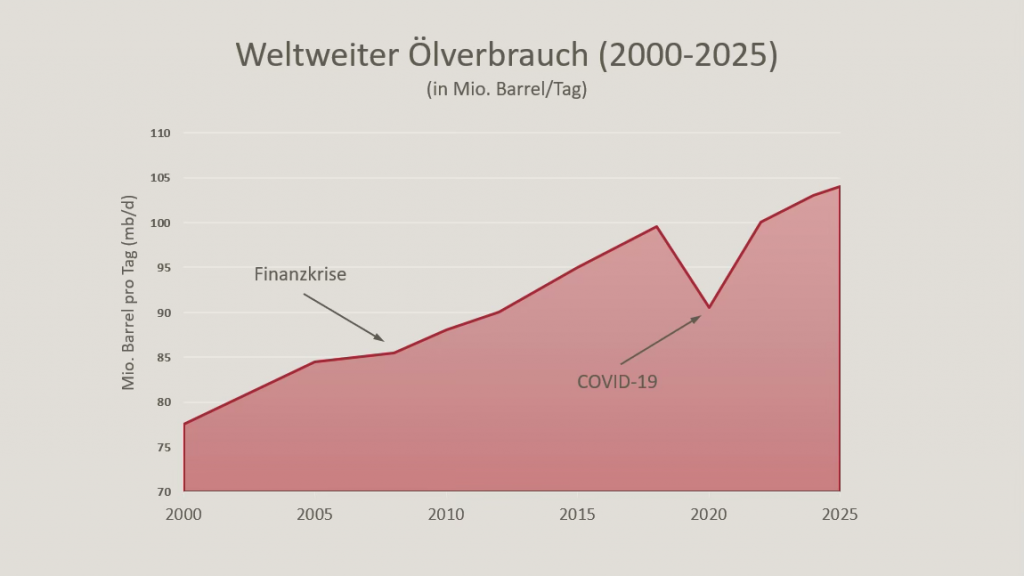 Trotz aller Sparbemühungen und neuen Technologien zur Stromerzeugung, Heizung und Mobilität (Elektroautos) ist der weltweite Verbrauch an Öl- und Erdgas in den letzten 25 Jahren kontinuierlich gestiegen. Es gab lediglich zwei zwischenzeitlicher Rücksetzer, nämlich während der Finanzkrise (leicht) und Covid (ausgeprägt). Bei Erdöl erhöhte sich der globale Verbrauch von 76/77 Millionen Barrel pro Tag im Jahr 2000 auf 102-105 Barrel pro Tag in 2025. Der Pro-Kopf-Verbrauch ist allerdings mit Blick auf die gewachsene Erdbevölkerung mit rund 5 Barrel pro Kopf/Jahr nahezu konstant geblieben.