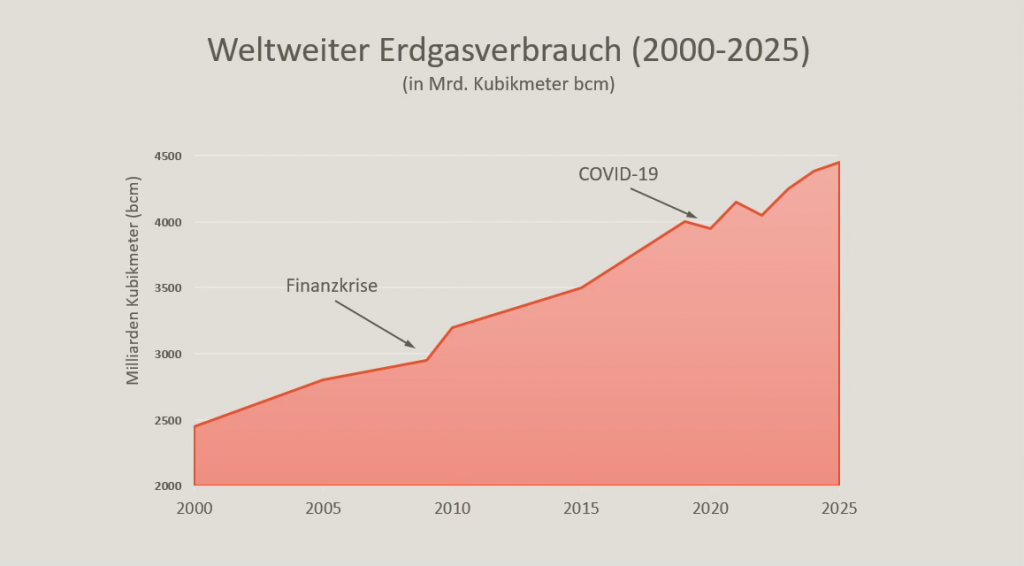 Anders beim Erdgas: Hier ist der Weltverbrauch deutlicher gestiegen, und zwar von 2,3-2,4 Billionen m³ zur Jahrtausendwende auf 4,2-4,3 Billionen m³ im letzten Jahr. Ursächlich hierfür ist, dass Gas in vielen Regionen Kohle beim Heizen verdrängt hat und auch in der Industrie neue Anwendungen gefunden hat. Der weltweite Pro-Kopf-Verbrauch nahm von 370 m³ im Jahr 2000 auf 520 m³ im Jahr 2025 merklich zu.