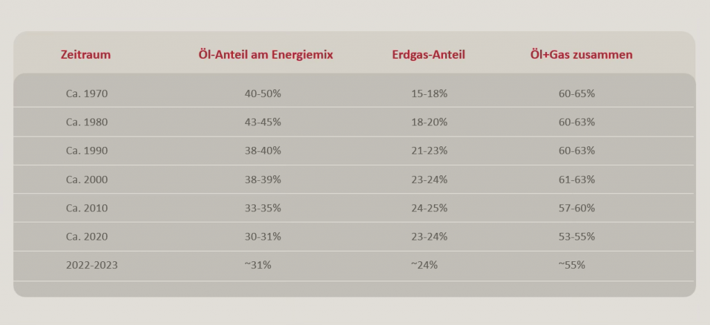 Zusammengenommen hat sich der Anteil von Öl und Gas am weltweiten Energiemix, dank alternativer Energiequellen, zwar von 60-65% in den 70er Jahren auf rund 55% merklich verringert. Fossile Brennstoffe sind aber immer noch mit Abstand der wichtigste Energieträger. Im internationalen Schiffstransport sind sie zum Beispiel mit über 90% immer noch die beherrschende Energiequelle.