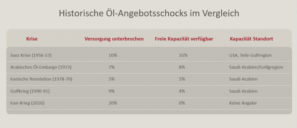 Bezogen auf die beiden fossilen Energieträger betrifft der Iran-Krieg den Gasmarkt in geringerem Ausmaß. Zwar kommt rund ein Viertel des global gehandelten Flüssiggases (LNG) aus der Region. LNG macht aber nur ein Fünftel des gesamten Gasmarktes aus. 80% des weltweit verbrauchten Erdgases wird über Pipelines transportiert. Der Effekt auf den globalen Ölmarkt ist dagegen deutlich größer. In normalen Zeiten passieren täglich 20 Millionen Barrel Rohöl die Straße von Hormus, was knapp 20% des Weltverbrauchs entspricht. Sollte die Blockade Bestand haben, wäre dies die größte Angebotseinschränkung des globalen Ölhandels in seiner Geschichte. Das Problem verschärft sich noch, da – im Vergleich zu früheren Ölkrisen – keine wesentlichen Ersatzkapazitäten zur Verfügung stehen. Mögliche Zusatzkapazitäten befinden sich primär in den unmittelbar betroffenen Ländern Saudi-Arabien und Vereinigte Arabische Emirate. Es gibt zwar eine begrenzte Möglichkeit von maximal 7 Millionen Barrel täglich über die sogenannte Ost-West Pipeline von Saudi-Arabien ins Rote Meer sowie eine Pipeline der Vereinigten Arabischen Emiraten in den indischen Ozean mit einer Kapazität von 1,5 Millionen Barrel pro Tag. Die Pipelines können aber den Angebotsausfall durch eine Blockade des Seewegs nur bedingt kompensieren. Auch die veränderte politische Situation in Venezuela, dem Land mit den weltweit höchsten Ölreserven, kann hier kurzfristig nicht helfen. Die dortige Infrastruktur ist durch fehlende Investitionen und Korruption weitgehend zerstört. Das Land kann daher nur rund 1% des Weltbedarfs an Erdöl (rund 1 Million Barrel pro Tag) abdecken. Zudem handelt es sich beim Erdöl aus Venezuela vorwiegend um schweres Öl (70% der Reserven), das aufwendig zu fördern, transportieren (muss mit importiertem Leichtöl vermischt werden) und zu verarbeiten ist. Aktuell können nur wenige US-Raffinerien schweres Öl verarbeiten.